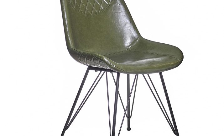 Cadeira para sala de jantar ou cozinha, composta por metal e pele sintética, está disponível em dois tons de castanho, verde, cinzento ou toupe.